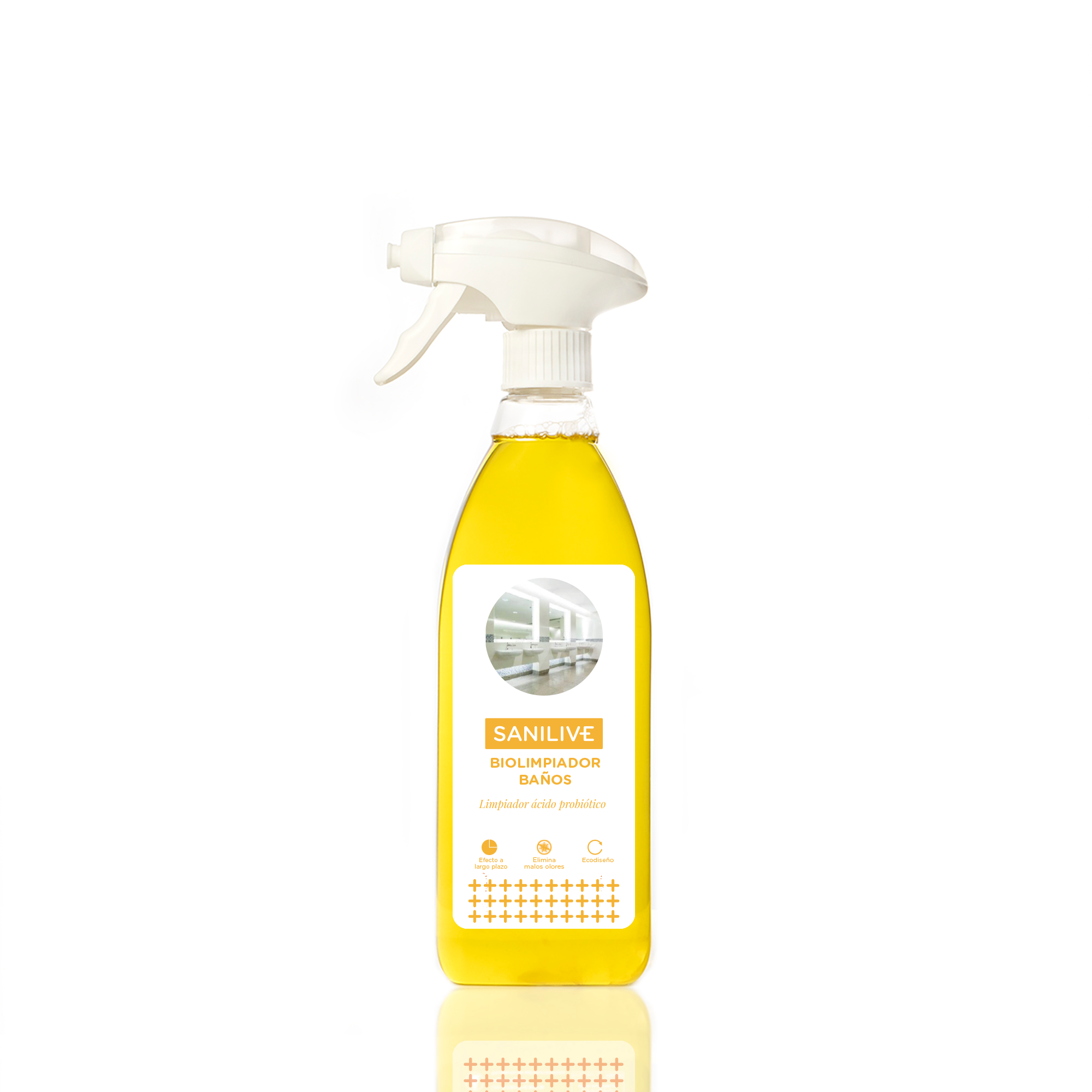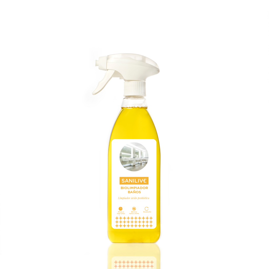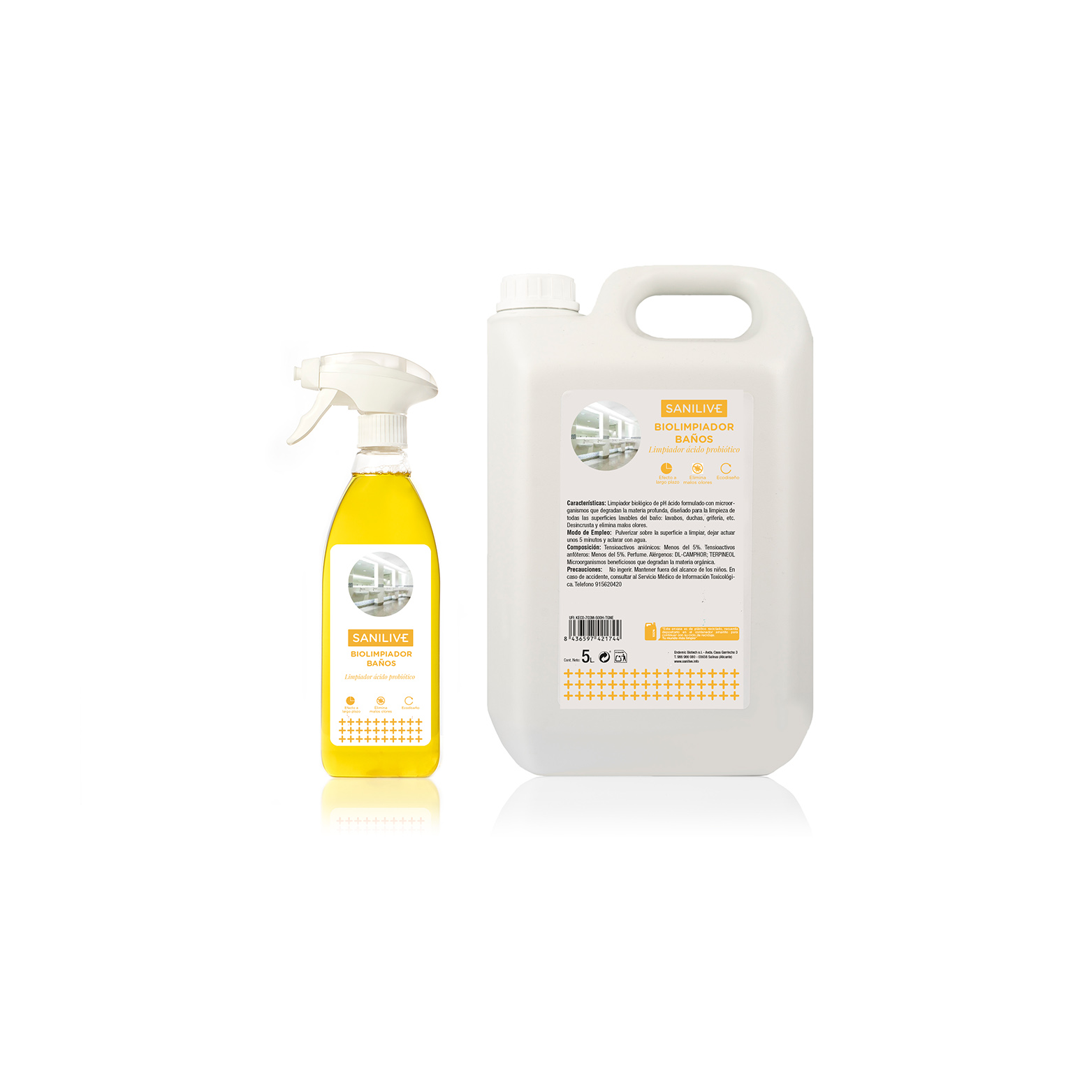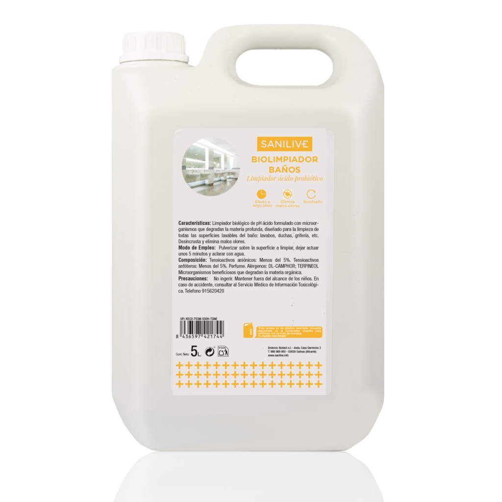 Limpiador probiótico de pH ácido formulado con microorganismos que degradan la materia orgánica, diseñado para la limpieza profunda de todas las superficies lavables del baño: lavabos, duchas, grifería, etc. Formulado con ácido de origen natural y bacterias beneficiosas que producen enzimas que degradan la suciedad, además de desincrustar y eliminar malos olores.